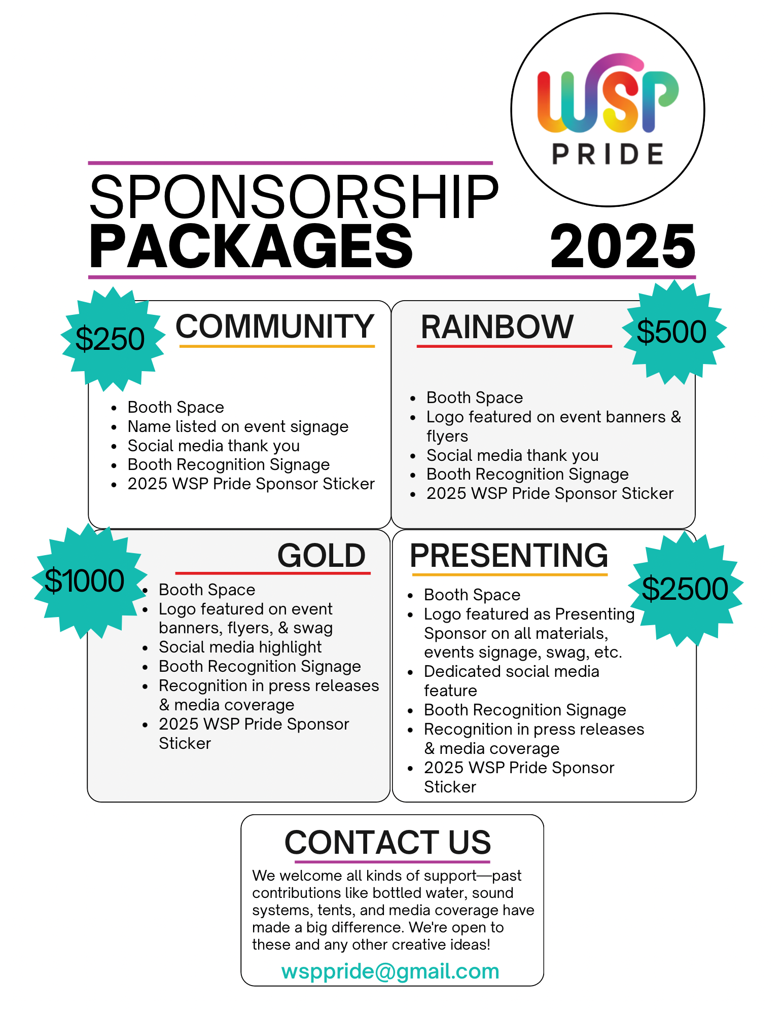Each year, we continue to grow and grow. Hundreds of community members join us, and we nearly ran out of room for all of our amazing sponsors and community vendors. We're thrilled to continue expanding this event with your support! Join us in making history and leaving a lasting mark on our community. Your support will help ensure that the spirit of Pride continues for generations to come. For more information on how to become a sponsor, take a look at our options below, email us at wsppride@gmail.com, or click here to complete a sponsor application!